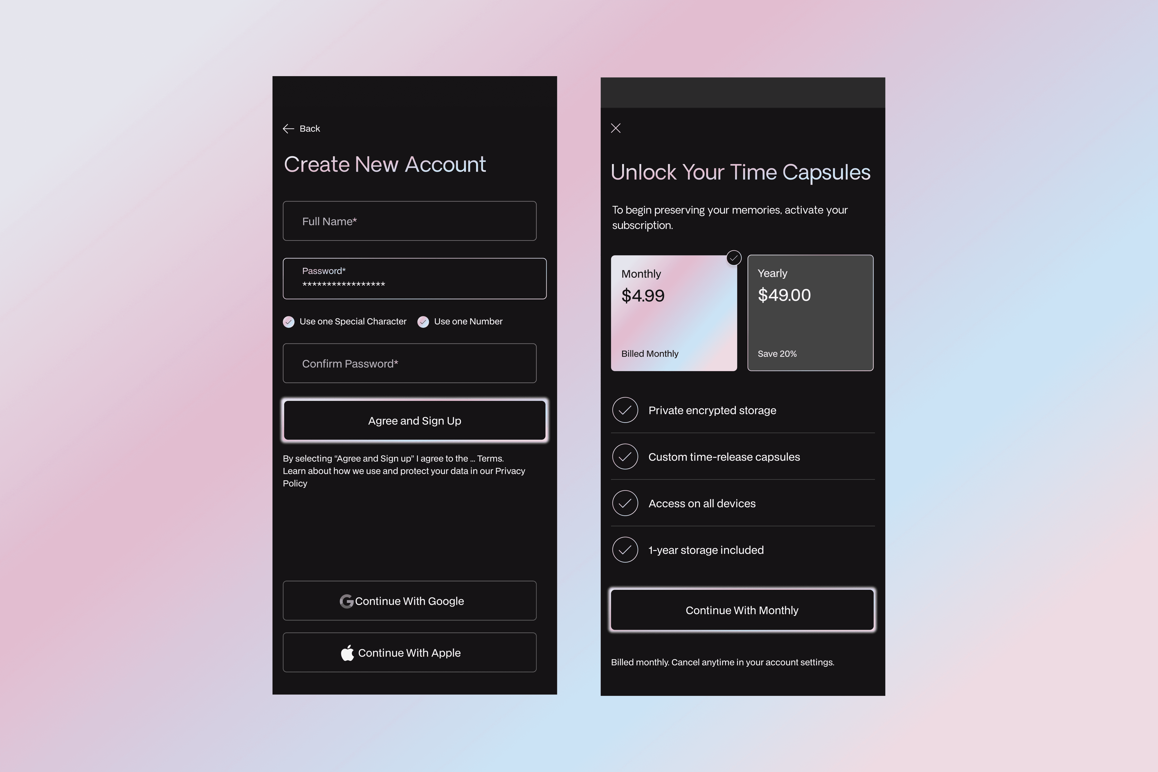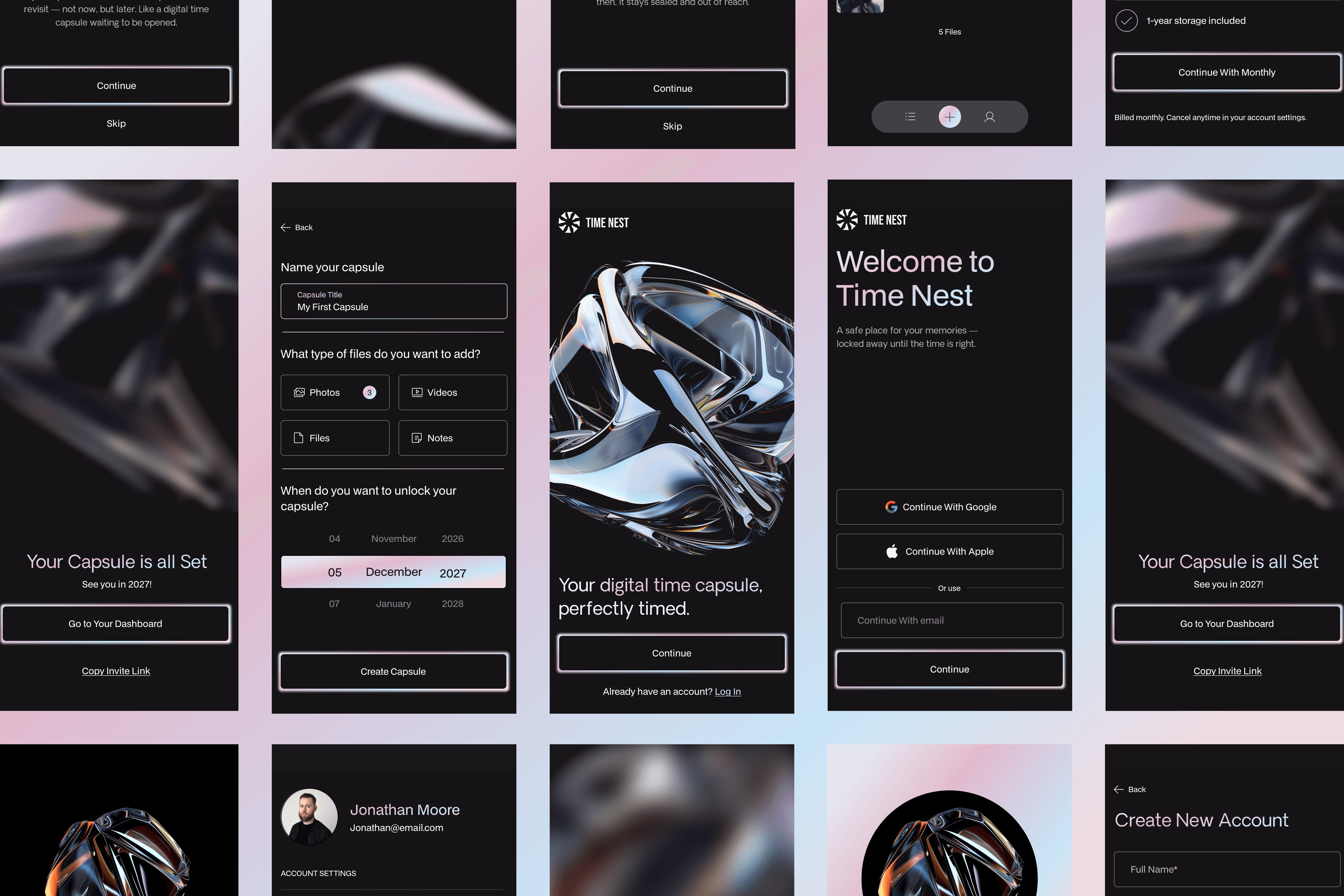 Time Nest is a cloud-based mobile app designed to help people preserve personal memories, messages, and media through time-based digital capsules. Rather than functioning as traditional cloud storage, the product allows users to lock photos, videos, files, and notes until a chosen future date. I led the product design end to end, shaping the core concept, user flows, and UI, with a focus on clarity, emotional restraint, and long-term usability. The experience supports both private and shared capsules, scheduled unlocks, and gentle reminders when content is ready to be revisited.
